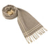 - やや粗い織り感のウールカシミヤ素材を用いたフリンジマフラーです。ベージュ系のガンクラブチェックとキャメルカラーのダブルフェイスになりまして、汎用性の高い一枚に仕上がっています。