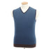 滑らかなタッチのハイゲージウール素材を用いたVネックニットベスト。ネイビー×ブルーの本体に、ブラウンのリブを配したきれいな色合いが高級感と洒落感を感じさせる一着。単調になりがちな秋冬コーディネートの差し色としても重宝します。