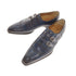 シューレースの代わりに細いストラップを配した変則ダブルモンク。ブルーとネイビーの美しいパティーヌも魅力。