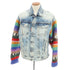 - ヴィンテージライクなウォッシュドデニムに、ハンドメイド風のカラフルなニットスリーブを組み合わせた個性あふれるデニムジャケットです。デニム部分は程よい色落ちとアタリ感が魅力で、ニット部分のマルチカラーが遊び心を添えています。クラシックなトラッカージャケットの形をベースにしながら、アートピースのような存在感を放つデザイン。シンプルなパンツと合わせるだけで、スタイリングの主役として引き立ちます。