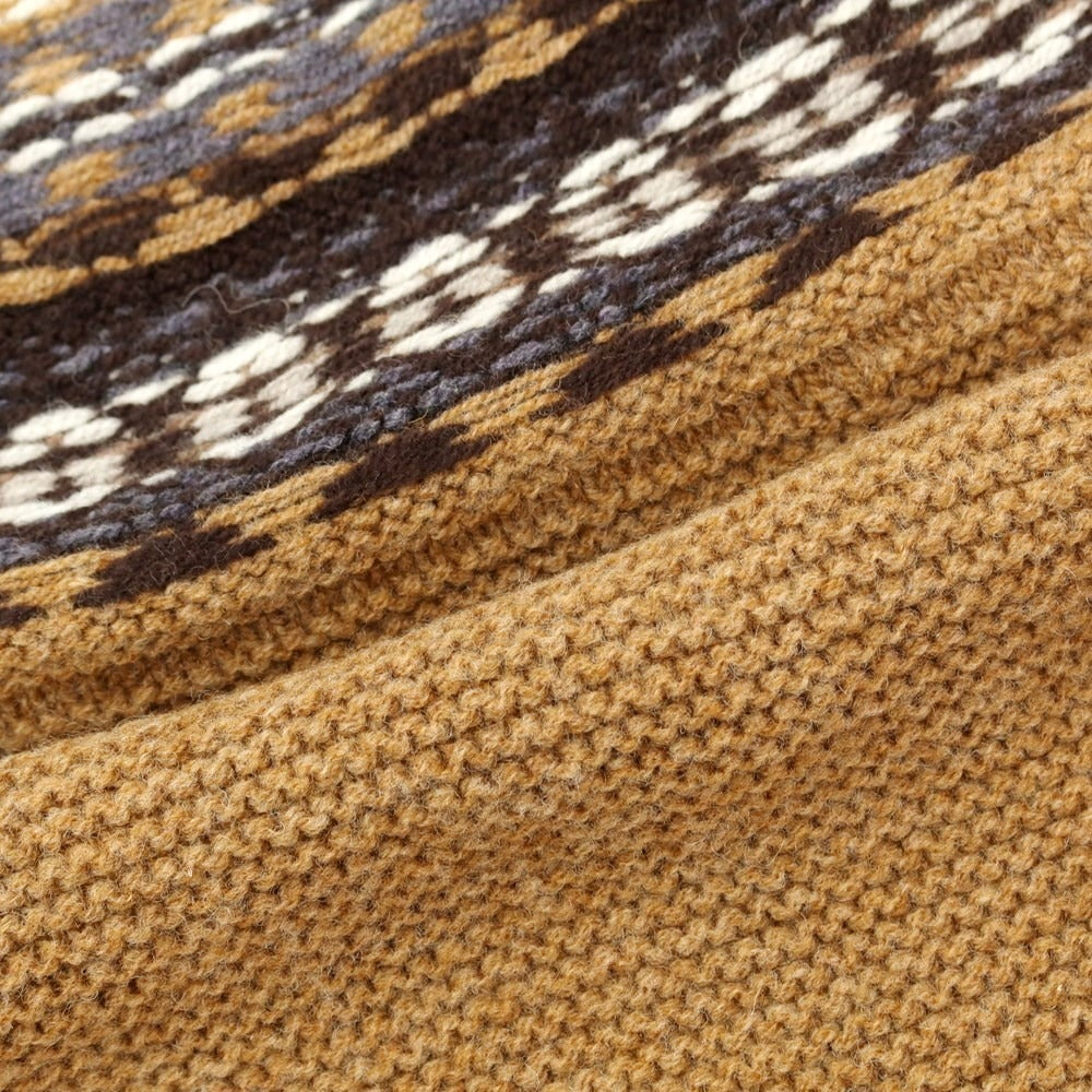 立体的でしなやかなウールニット地を使用した、ロールネックニットです。ざっくりと編まれた起毛感のあるニット生地に暖かみがあり、落ち着いた配色が上品な雰囲気を醸し出す一着です。